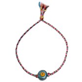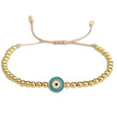 Joli bracelet composé d'un fil fin et d'une breloque en or avec un mauvais œil dessus. Vous pouvez faire glisser le bracelet à la bonne taille grâce à une perle coulissante.