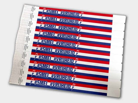 Que le jour de la libération brille avec les bracelets Tyvek | Thema de la Journée de la Libération du 5 mai | 500 pièces de VanDerEng BV. Avec une impression thématique en couleur accrocheuse, il est facile de voir qui a accès à votre événement spécial. La bande anti-fraude dans la fermeture empêche les bracelets d'être détachés sans endommager la bande adhésive, empêchant ainsi tout transfert non autorisé.