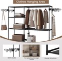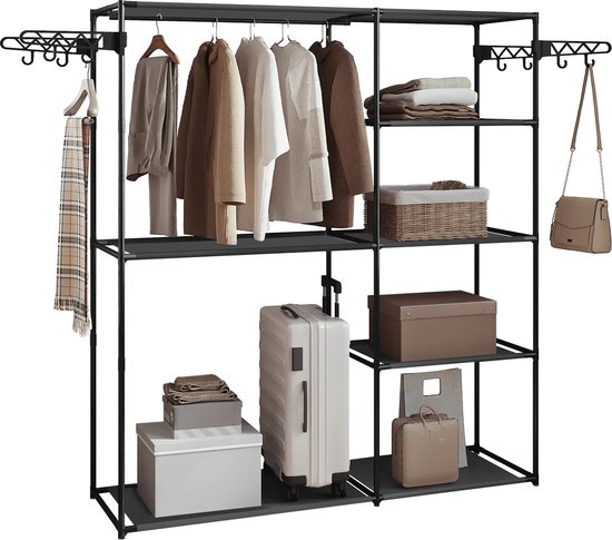 Ce portant à vêtements ouvert BukkitBow offre d'excellentes options de rangement pour tous vos vêtements et accessoires. Avec une capacité de charge totale de 30 kg, comprenant une tringle de suspension d'une capacité de 15 kg et huit étagères en tissu non tissé d'une capacité de charge de 5 kg chacune, vous pouvez facilement garder les vestes, chemises, robes, chaussures et autres articles organisés et à portée de main. tenir. Quatre crochets supplémentaires pour chapeaux, sacs et écharpes gardent tout propre et bien rangé.