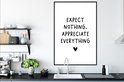 Cadre - Affiche - Citation anglaise "N'attendez rien, appréciez tout" avec un coeur sur fond blanc - Cadre photo