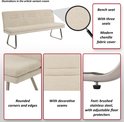 Le coin salon généreux de ce banc de cuisine peut accueillir jusqu'à trois personnes, ce qui le rend idéal pour des réunions chaleureuses dans la salle à manger ou la cuisine. Les pieds robustes en acier inoxydable brossé soulignent la finition de haute qualité et confèrent un look à la fois moderne et intemporel. Les protections de sol réglables sont un complément pratique qui non seulement protège le sol, mais permet également une parfaite adaptation aux différentes surfaces. Cela signifie que votre canapé est toujours stable et sûr. Doté d'une capacité de charge élevée, ce canapé prouve sa robustesse et sa durabilité. La construction stable composée de matériaux de haute qualité garantit une longue durée de vie, même en cas d'utilisation quotidienne. Le montage est extrêmement simple : les pieds peuvent être fixés rapidement et facilement, de sorte que le canapé est prêt à l'emploi en un rien de temps.