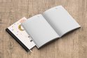 Le bloc -notes a une couverture rigide et est fini avec une reliure noire. Cette reliure a un aspect daim, ce qui lui donne un aspect luxueux. En raison de la reliure noire, le carnet a un dos partiellement noir. En raison de sa taille compacte, le carnet à couverture rigide est facile à transporter.