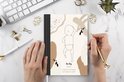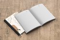 Le bloc -notes a une couverture rigide et est fini avec une reliure noire. Cette reliure a un aspect daim, ce qui lui donne un aspect luxueux. En raison de la reliure noire, le carnet a un dos partiellement noir. En raison de sa taille compacte, le carnet à couverture rigide est facile à transporter.