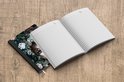 Le bloc -notes a une couverture rigide et est fini avec une reliure noire. Cette reliure a un aspect daim, ce qui lui donne un aspect luxueux. En raison de la reliure noire, le carnet a un dos partiellement noir. En raison de sa taille compacte, le carnet à couverture rigide est facile à transporter.
