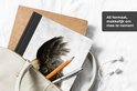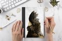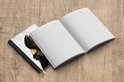 Le bloc -notes a une couverture rigide et est fini avec une reliure noire. Cette reliure a un aspect daim, ce qui lui donne un aspect luxueux. En raison de la reliure noire, le carnet a un dos partiellement noir. En raison de sa taille compacte, le carnet à couverture rigide est facile à transporter.