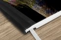 Un éléphant recouvert de peinture jaune, rouge, verte et bleue est représenté sur un fond noir.