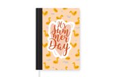 Le carnet A5 a des pages avec des lignes pré-imprimées et une barre pour régler la date. Ainsi, vous pouvez écrire vos notes proprement et de manière ordonnée. De plus, le bloc-notes contient un signet, afin que vous sachiez exactement sur quelle page vous êtes resté. Le cahier contient 98 pages. Cela vous permet d'avancer un moment avant que le livret ne soit plein !