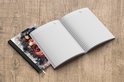 Le bloc -notes a une couverture rigide et est fini avec une reliure noire. Cette reliure a un aspect daim, ce qui lui donne un aspect luxueux. En raison de la reliure noire, le carnet a un dos partiellement noir. En raison de sa taille compacte, le carnet à couverture rigide est facile à transporter.