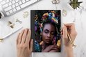 Femme sur fond noir. Elle est entourée de feuilles et de fleurs de différentes couleurs.