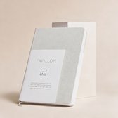 Le bloc -notes a une couverture rigide et est fini avec une reliure noire. Cette reliure a un aspect daim, ce qui lui donne un aspect luxueux. En raison de la reliure noire, le carnet a un dos partiellement noir. En raison de sa taille compacte, le carnet à couverture rigide est facile à transporter.
