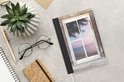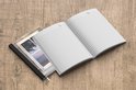 Le bloc -notes a une couverture rigide et est fini avec une reliure noire. Cette reliure a un aspect daim, ce qui lui donne un aspect luxueux. En raison de la reliure noire, le carnet a un dos partiellement noir. En raison de sa taille compacte, le carnet à couverture rigide est facile à transporter.