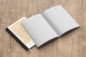 Le bloc -notes a une couverture rigide et est fini avec une reliure noire. Cette reliure a un aspect daim, ce qui lui donne un aspect luxueux. En raison de la reliure noire, le carnet a un dos partiellement noir. En raison de sa taille compacte, le carnet à couverture rigide est facile à transporter.