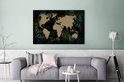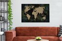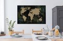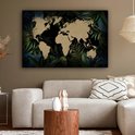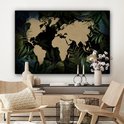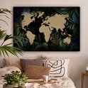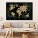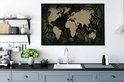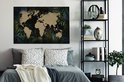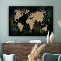 Carte du monde couleur sable sur fond noir, encadrée de feuilles et fleurs bleues 120x80 cm