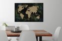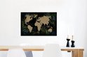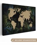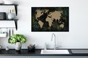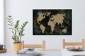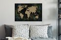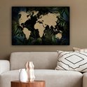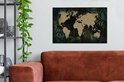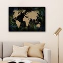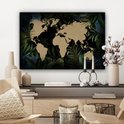 Carte du monde couleur sable sur fond noir, encadrée de feuilles et fleurs bleues 60x40 cm