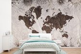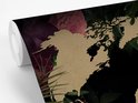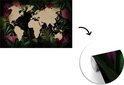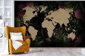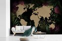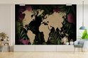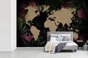 Carte du monde couleur sable sur fond noir, encadrée de feuilles et fleurs tropicales 330x220 cm