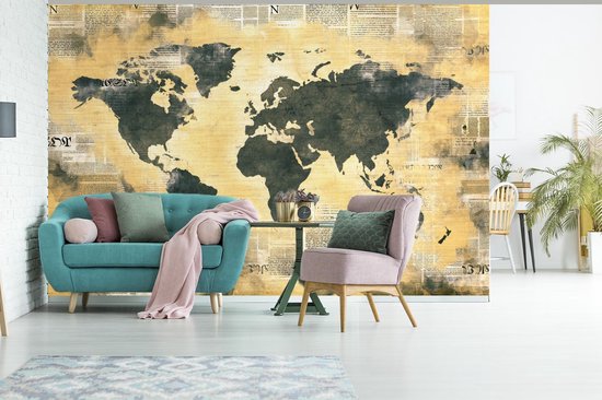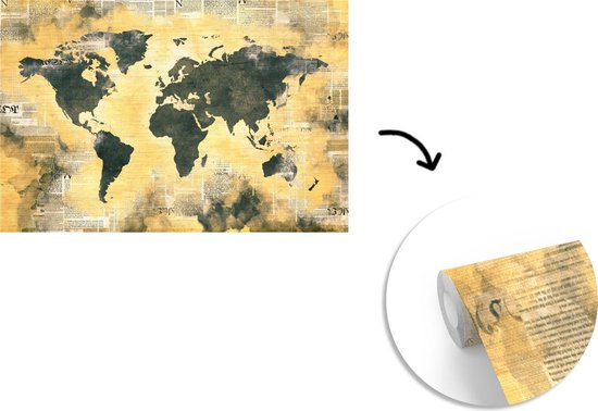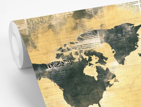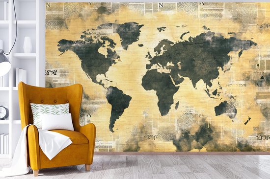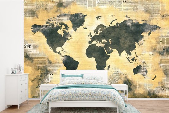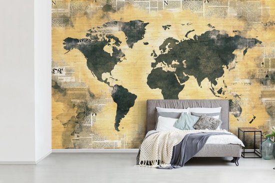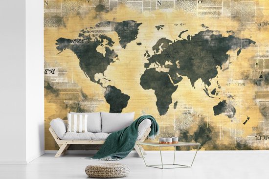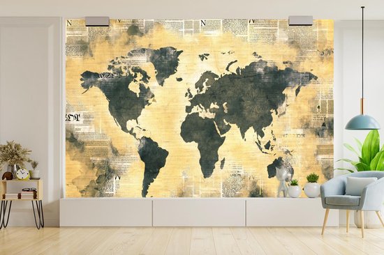 Carte du monde sombre avec peinture orange et gris foncé sur fond de papier journal 420x280 cm