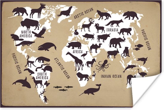 Carte du monde Witte avec fond marron et illustrations de silhouettes d'animaux 60x40 cm