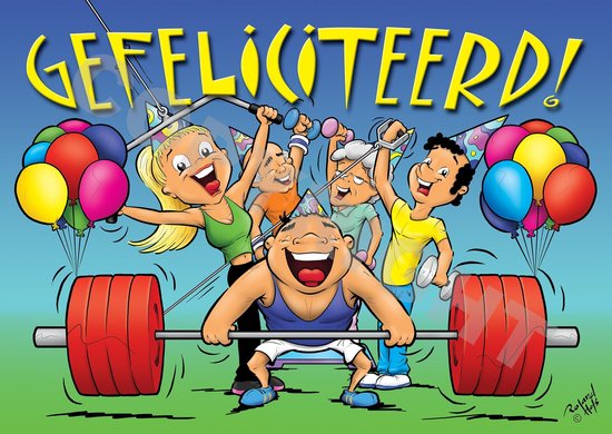Carte postale de félicitation de dessin animé joyeux. Conception par Roland Hols. La carte postale est au format A6 (10,5 x 14,8 cm). Belle carte pour que le propriétaire du gymnase surprenne les membres le jour de leur anniversaire.