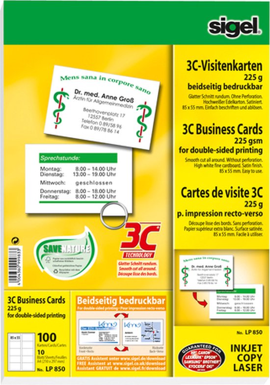 Cartes de visite PC à concevoir vous-même avec un PC et une imprimante. kanten lisses tout autour, sans perforation. Ça a l'air professionnel de l'imprimerie. Imprimable recto-verso, 225 g, blanc élevé, pour toutes les imprimantes jet d'encre, laser et copieurs.