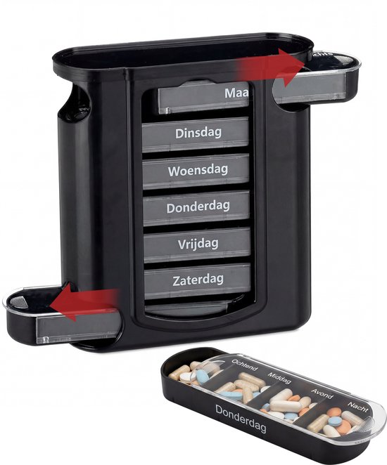 Avec cette boîte à pilules, vous apportez à votre maison une combinaison de style, de fonctionnalité et de vue d'ensemble. Son design noir s'intègre à tous les environnements, tandis que sa disposition pratique et son couvercle coulissant facilitent son utilisation, même pour les personnes ayant une dextérité ou une vision réduite. Perfect pour organiser efficacement et en toute sécurité la prise de vos médicaments.