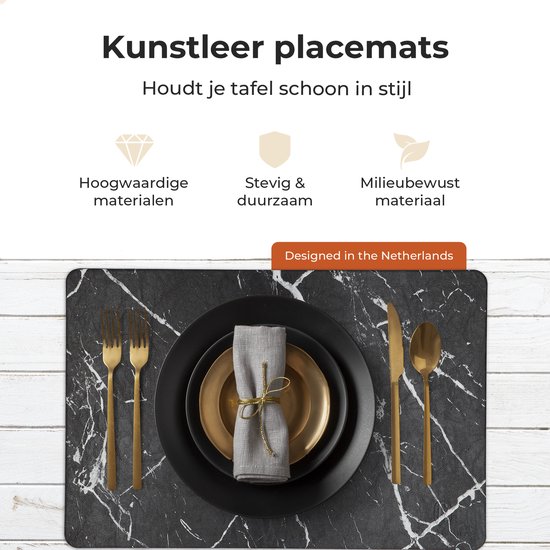Fabriqués en cuir artificiel de haute qualité, ils sont hydrofuges, de sorte que les liquides renversés n'ont aucune chance. De cette façon, votre table reste toujours soignée et impeccable. De plus, nos sets de table ont un fond antidérapant, afin qu'ils restent bien en place pendant les repas. Cela signifie moins de dégâts et plus de confort en mangeant.