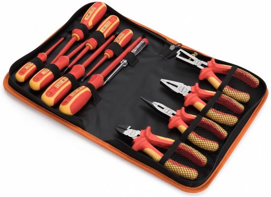 Cet ensemble d'outils VDE se compose de diverses pinces isolées et tournevis. L'ensemble est livré dans une pochette solide avec une fermeture éclair. Les outils sont résistants jusqu'à 1000V.