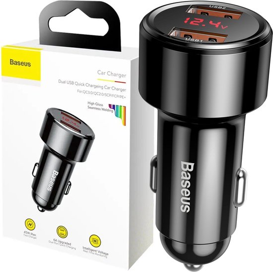Chargement rapideAvec le chargeur de voiture Baseus , vous pouvez charger vos appareils avec 45 W sans vous soucier d'endommager votre équipement. La prise en charge de protocoles rapides tels que : QC 3.0/2.0, SCP, FCP, AFC, MTK PE vous permet de charger rapidement deux appareils en même temps.