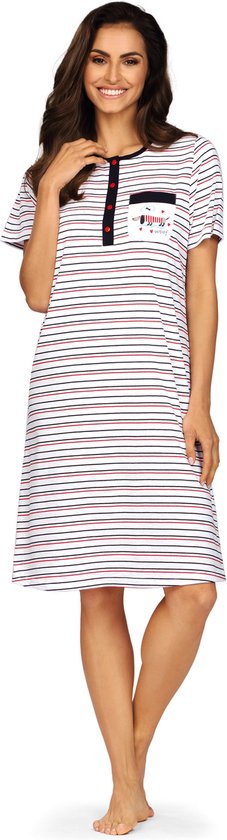 Une chemise de nuit Comtessa à manches courtes et en 100% coton. La chemise de nuit de couleur blanche a un motif rayé continu. L'encolure ronde est élégamment finie avec une bordure noire et dispose d'une patte à 4 boutons. De plus, la chemise de nuit a une poche poitrine avec un imprimé de chien. La longueur de cette chemise de nuit est de 100 cm.