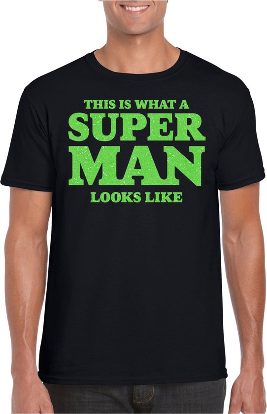 T-shirt habillé pour homme en noir avec imprimé pailleté en vert. Ce joli T-shirt est imprimé avec le texte : This is What a Super Man Look Like. Vous avez bientôt une mauvaise party, un carnaval ou une autre fête pailletée et glamour ? Alors ce T-shirt est indispensable ! C'est aussi un très joli T-shirt à offrir à votre père pour la Vaderdag . La chemise est également agréable à offrir ou à porter lors d'une sortie. Matériel: 145 grammes, 100% coton. Merk: Bellatio Decorations.