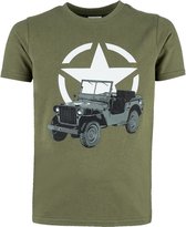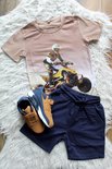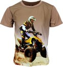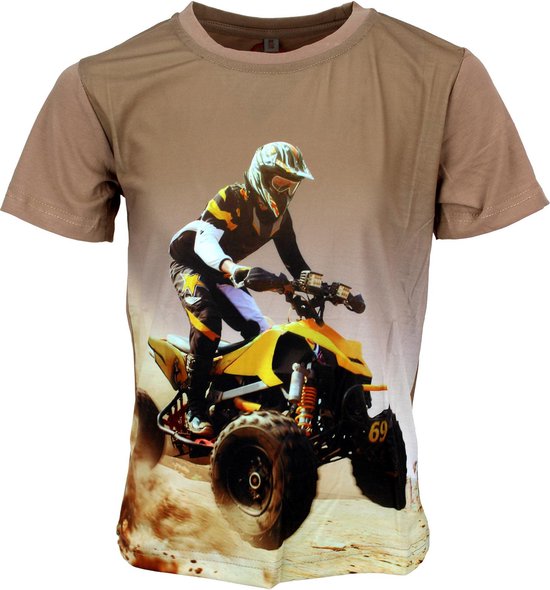 Joli t-shirt marron avec une image d'un quad avec chauffeur. De la taille 98 à 164. Sympa avec le short camel.