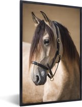 Cheval andalou devant un cadre photo fond en bois noir sans passe partout
