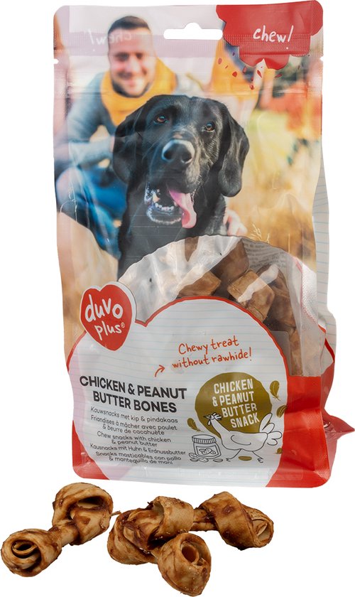 Les délicieux snacks duvoplus chew ! font le bonheur des chiens, mais aussi de leur maître. Ces friandises à base de poulet et beurre de cacahuètes conviennent parfaitement comme compléments alimentaires et comme passe-temps pour nos compagnons à quatre pattes. En plus, ils n'ont ni sucres ajoutés, ni peau de boeuf. Mais attention ! Évitez que votre chien ne grignote trop ! duvoplus chew ! doit être considéré comme un complément à l'alimentation quotidienne de votre chien, histoire aussi de la diversifier. Mâcher, oui, mais avec modération :-) !