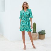 Cette combishort ressemble à une robe portefeuille de face, mais elle est en fait dotée d'un pantalon. Idéal ! Les manches longues sont finies avec des volants. Boutonnez et nouez la combinaison à la taille gauche de manière confortable voor jou . Partez-vous en vacances? Assurez-vous de prendre cette combinaison avec vous !