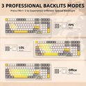 Le clavier dispose de 18 effets de rétroéclairage RVB, dont cinq niveaux de luminosité et une vitesse réglable. Choisissez parmi trois modes professionnels (FPS, LOL, Office) via FN+1-3 pour une expérience visuelle personnalisée, parfaitement adaptée à votre cas d'utilisation.