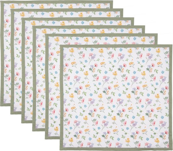 Clayre & Eef Serviettes Coton set de 6 40x40 cm Blanc Vert Carré Fleurs
