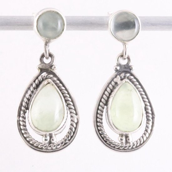 Clous d'oreilles en argent faits à la main, magnifiquement coupés et sculptés, chacun avec deux belles pierres de préhnite taillées en cabochon. La teneur en argent est de 925.