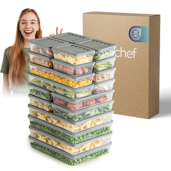 La Soft Chef Fresh Box est une solution intelligente et peu encombrante20 pièces ensemble pour koelkast etcongélateur . Entièrement conçu et produit dans notre eigen fabriek fabriqué en PP sans BPA. Couvercles hermétiques et anti-fuites, empilables et emboîtables. Idéal pour la préparation des repas, les restes et la congélation jusqu'à-25°C .