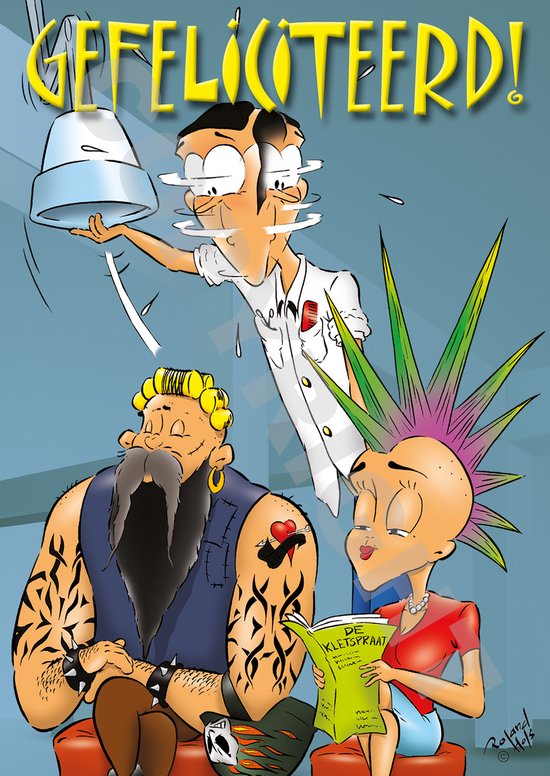 Carte postale d'anniversaire de coiffeur gai. Conception de bande dessinée par Roland Hols. La carte postale est au format A6 (10,5 x 14,8 cm). 'Félicitations' sur le devant. Une jolie carte pour surprendre vos clients le jour de leur anniversaire.