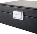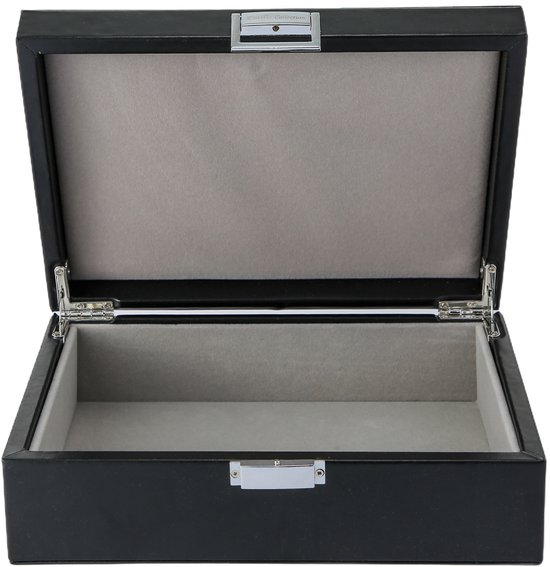 La boîte à bijoux est faite de similicuir noir classique et d'une doublure en velours gris doux.