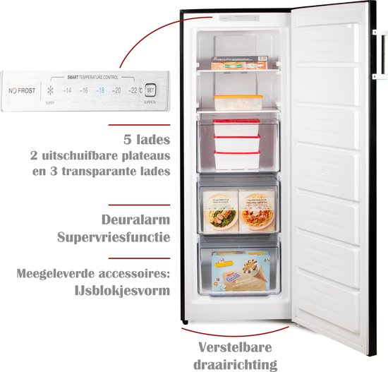 Profitez d'une organisation claire grâce aux 2 étagères extensibles et aux 3 tiroirs transparents. Ce congélateur noir, aux dimensions de 54 x 64,5 x 143 cm et avec porte réversible à fermeture magnétique, s'intègre parfaitement dans n'importe quelle pièce. L'appareil a un niveau sonore de 39 dB.