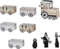 Tous les chariots mesurent 6,7 sur 15 centimètres. En plus du joli train, il comprend également 3 jolies poupées en papier, composées d'une sorcière, d'un vampire et d'un skelet. Les figurines peuvent être placées dans les wagons ou dans la locomotive pour la touche finale du train !