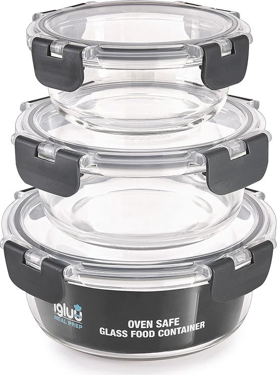 - RÉCIPIENTS RONDS EN VERRE DE DIFFÉRENTES TAILLES 3 tailles polyvalentes, idéales pour les fruits, les salades, les collations, les soupes et plus encore. Le verre non poreux n'absorbe pas les odeurs, les saveurs ou les taches des aliments, et le couvercle en polypropylène sans BPA est inodore, ce qui donne aux aliments le goût exactement tel que vous les avez préparés. Taille des contenants : 400 ml = 13,5 cm (d) x 6,1 (h), 650 ml = 15,5 cm (d) x 6,8 cm (h), 950 ml = 17,8 cm (d) x 7,3 cm (h)