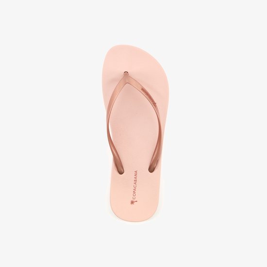Tongs Copacabana roses pour femme. Équipé d'une sangle d'orteil robuste de couleur cuivre. Les tongs ont une semelle en caoutchouc. Parce que les pantoufles peuvent se mouiller et sécher rapidement, elles sont idéales pour une journée à la plage ou à la piscine. Les Slippers de Copacabana sont faites de matériel végétalien !