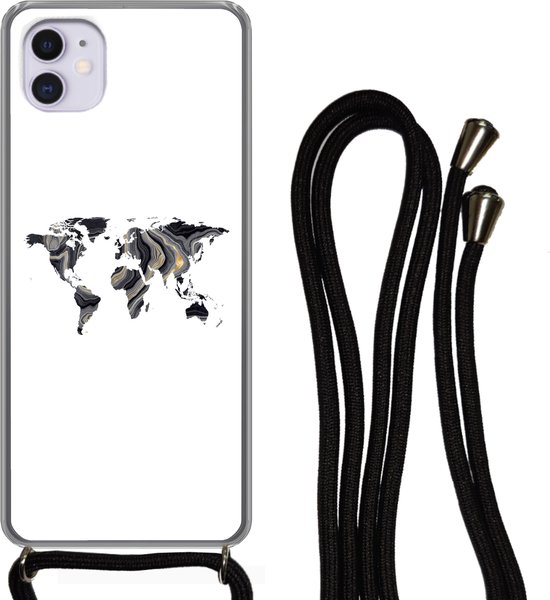 Coque avec cordon iPhone 11 - Carte du Wereldkaart - Goud - Ligne - Siliconen - Bandoulière - Coque arrière avec cordon - Coque pour téléphone avec cordon - Coque avec corde
