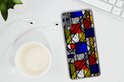 Cette œuvre d'art montre une version vitrail dans le style de Piet Mondrian.