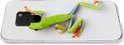 Portrait d'une grenouille sur un fond blanc. L'animal a une couleur vert vif.
