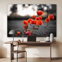 Un affichage impressionnant de coquelicots rouges sauvages dans un grand champ, complété par un fond noir et blanc.