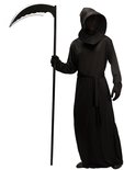 La longue cape noire à capuche offre un look menaçant, tandis que le visage est recouvert d'un tissu en maille respirant pour plus de mystère. Les gants inclus assurent un look soigné jusque dans les moindres détails, et la grande faux en plastique complète la outfit .