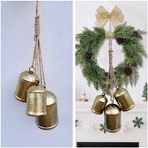 Très belles cloches de Noël en métal vieil or sur corde de jute.