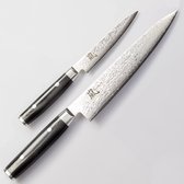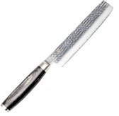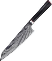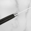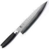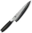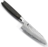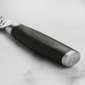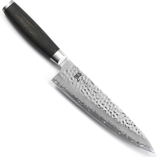 Cette icône de Yaxell excelle dans l'équilibre et le design. Le noyau en acier VG-10, enveloppé d'acier inoxydable de haute qualité, atteint une dureté de 61 Rockwell HRC. La surface martelée, ou « Tsuchime », réduit la friction lors de la coupe, favorisant ainsi une coupe sans effort.